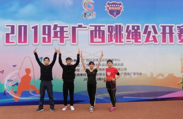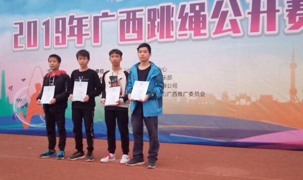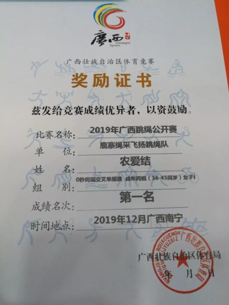 作为鹿寨县首支花样跳绳队,他们在赛场上他们奋力争先,与各路高手比实力,拼耐力,赛体力,经过激烈的角逐,一举拿下:30秒单摇跳、30秒间隔交叉单摇跳成年女子乙组(46-55周岁)的2项冠军,4×30秒单摇接力少年丙组(13—14周岁)亚军,3分钟10人长绳8字跳中学组第4名,30秒双摇跳少年丙组(13—14周岁)男子组第四名、30秒单摇跳少年丙组(13—14周岁)男子组第四名、第五名,30秒单摇跳少年丙组(13—14周岁)男子组、女子组第五名、30秒双摇跳少年丙组(13—14周岁)男子组第五名。其中,集教练与运动员于一身的农爱结(现在鹿寨县第二初级中学执教)以106个创造了30秒单摇跳成年女子乙组(46-55周岁)的赛会纪录,并获“优秀教练员”称号。