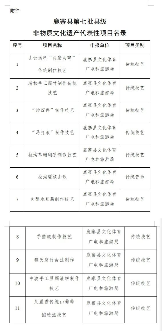 经县非遗管理部门收集、整理、评议以及专家评审,鹿寨县第七批县级非物质文化遗产代表性项目名录正式公布啦!那些藏在烟火里的老手艺、流淌在时光中的老技艺,这一次又有新成员加入非遗“大家庭”——或许是你守了半辈子的酿造技艺,或许是街坊们总怀念的传统美食制作,又或是那曲代代相传的山歌,此刻都有了更郑重的“身份认证”。 更值得期待的是,为了让这份传承被看见、被珍视。9月2日下午,在文化馆会议室里,将为新入选项目的代表性传承人颁发荣誉牌匾与证书。一块牌匾,是手艺的分量;一本证书,是坚守的勋章——这不仅是对过往坚守的肯定,更是对未来传承的期许:让老技艺在新时代里,依旧能鲜活地“走下去”。